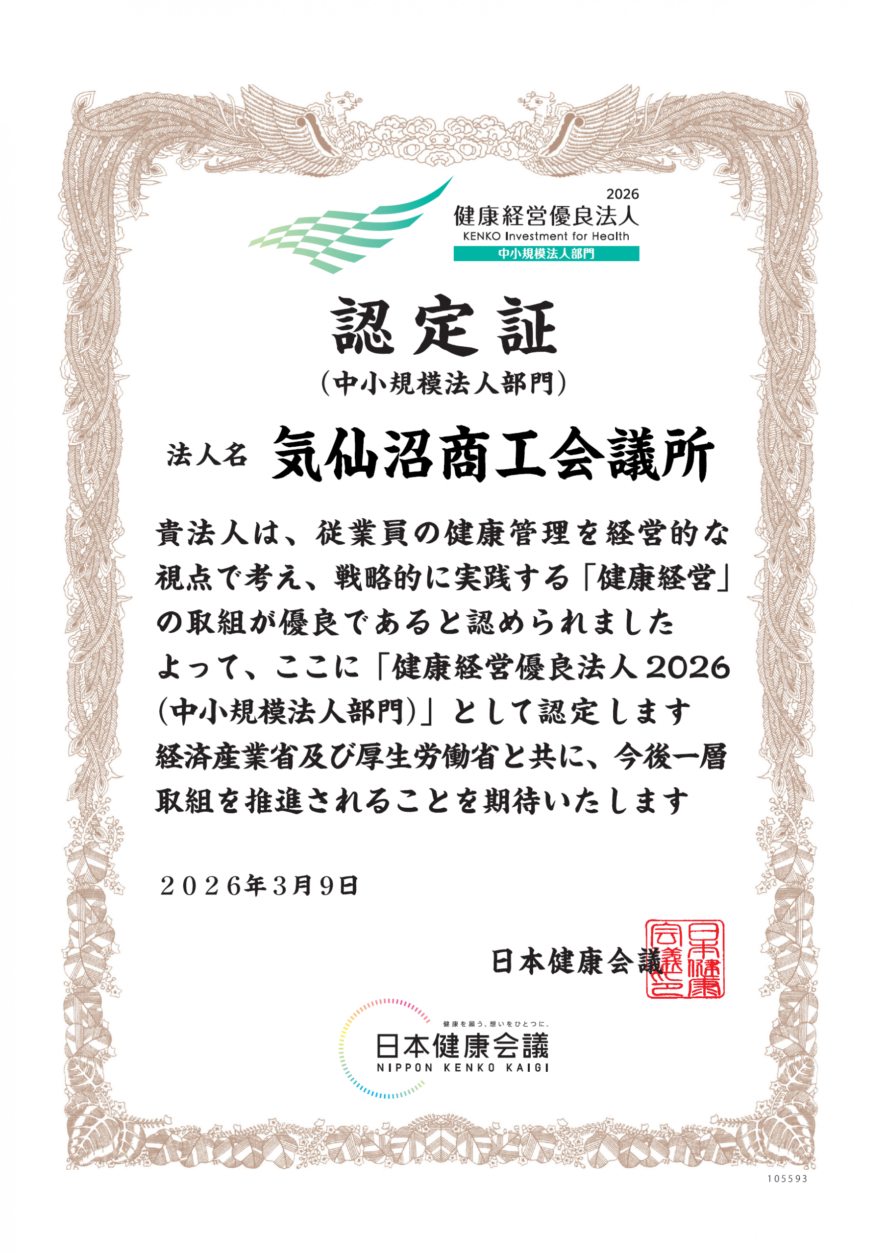 「健康経営優良法人2026認定証」